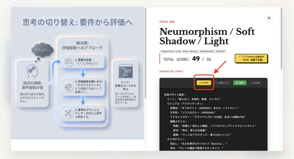ワンクリックで好きなデザインのプロンプトを一発で適用できるのが特徴です。