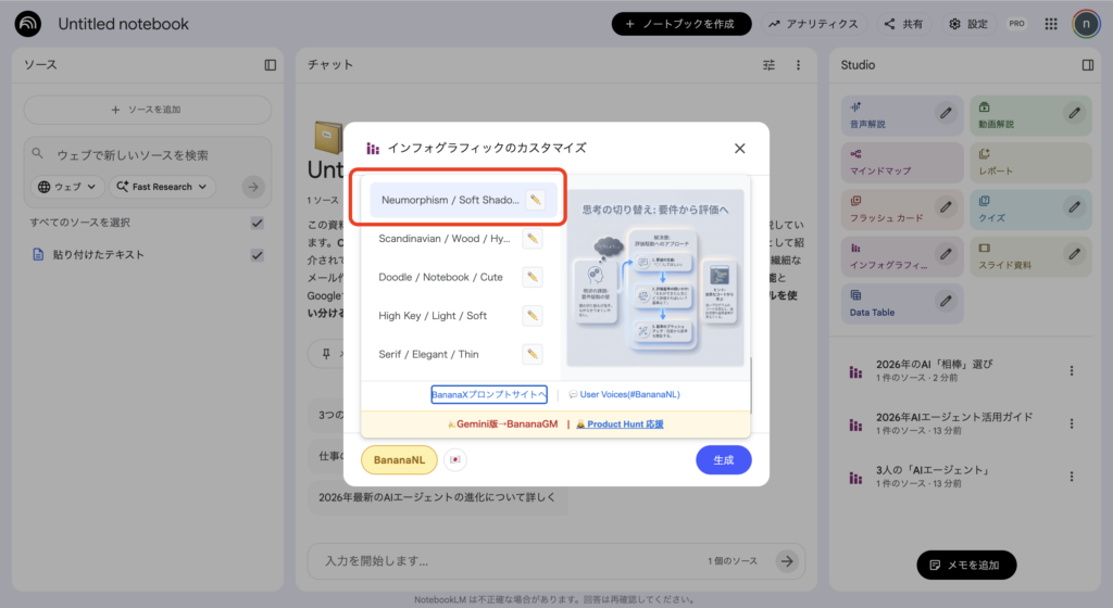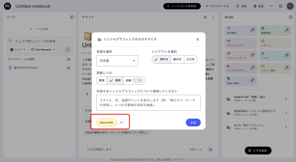 すると、NotebookLMに連携された「Banana LM」に自動的にプロンプトが保存され、